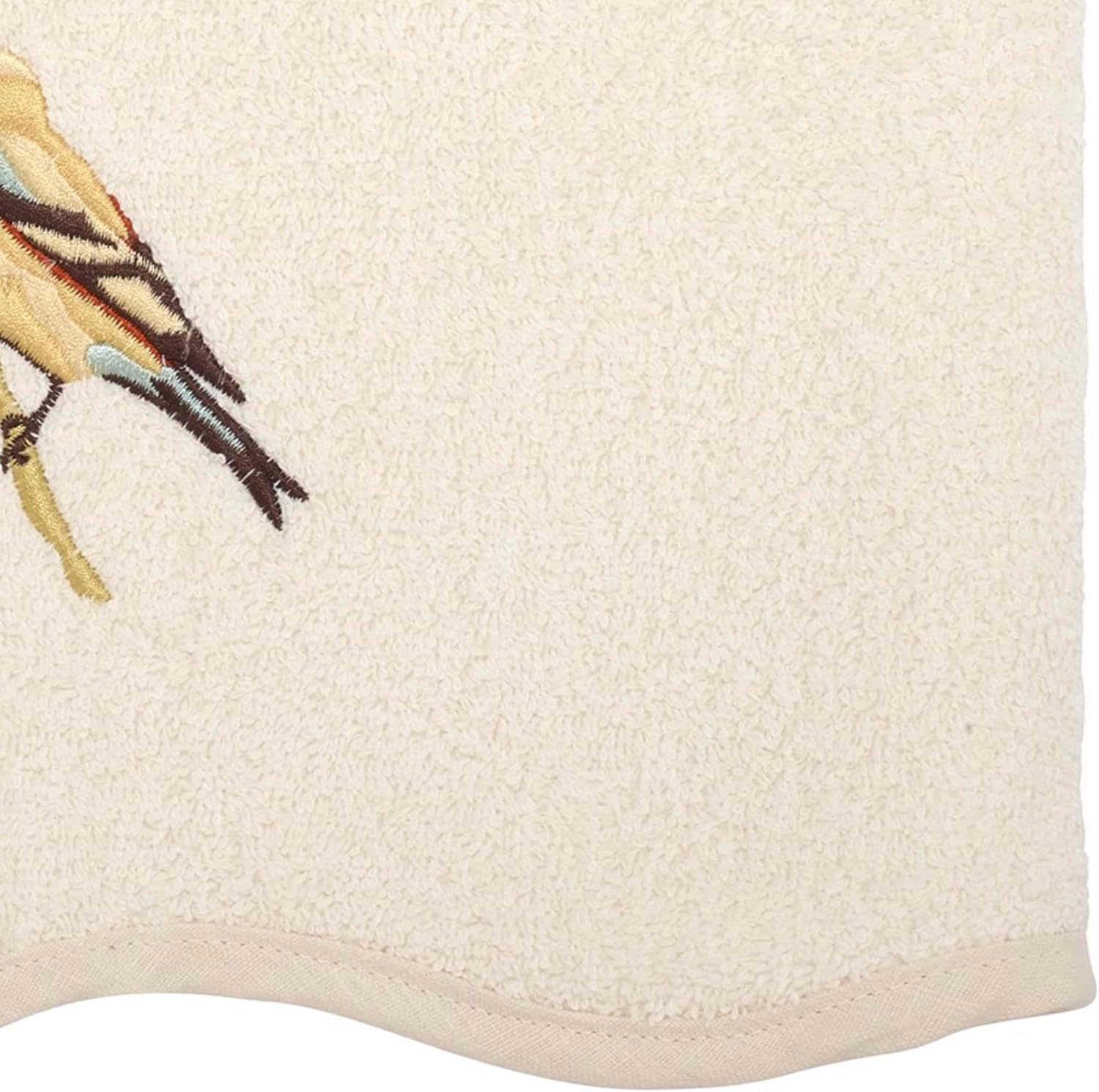 The Avanti Premier Songbirds collection towel features beautifully embroidered birds: The eastern bluebird, the scarlet tanager and the goldfinch. They are perched among branches, and the embroidery is on a 100% cotton (exclusive of embellishment) ivory terry towel. The end hem is scalloped and finished with a coordinating tonal satin band.