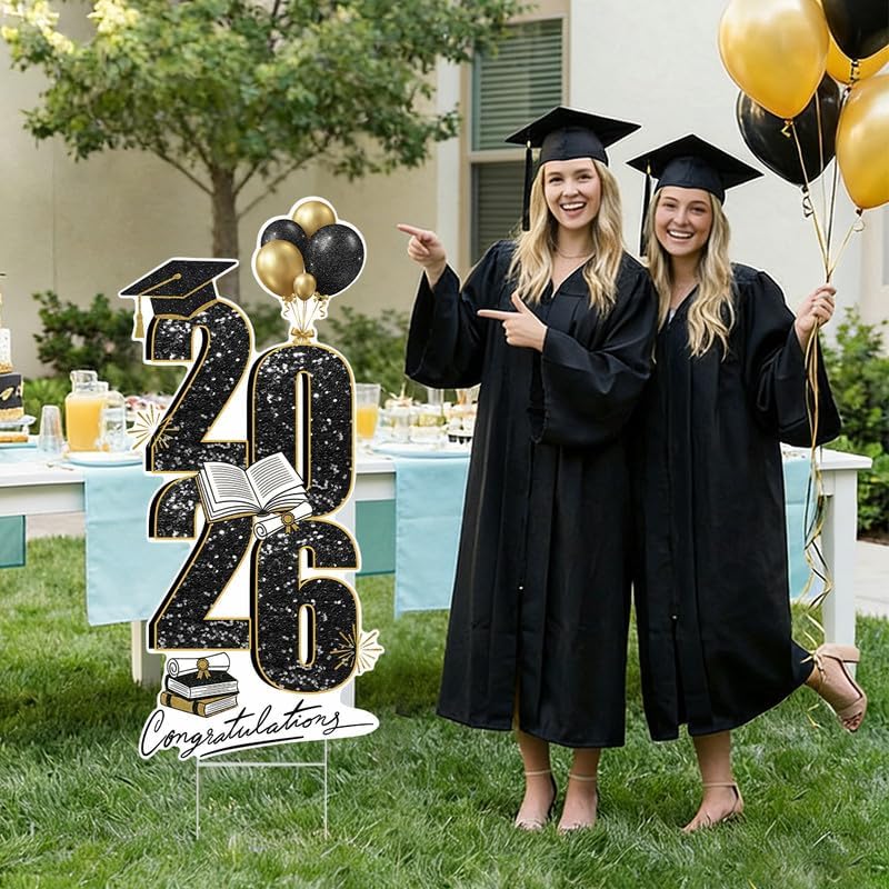 Celebrate your graduate’s big achievement with this Class of 2026 Graduation Yard Sign. Designed to stand 47 inches tall, this large graduation decoration features bold glitter-style numbers, graduation cap details, balloons, books, and a congratulatory design that makes it the perfect centerpiece for any graduation celebration. Whether you are celebrating a high school graduation, college graduation, or graduation party, this eye-catching sign will create the perfect festive atmosphere for your yard, lawn, or outdoor party space. The included ground stakes allow for easy installation so you can quickly place the sign in your yard for guests and neighbors to see. Perfect for: Graduation yard decorations Outdoor graduation party decor Graduation photo backdrops Grad party lawn displays Class of 2026 celebrations Celebrate the Class of 2026 in a big way with this beautiful graduation yard sign!
