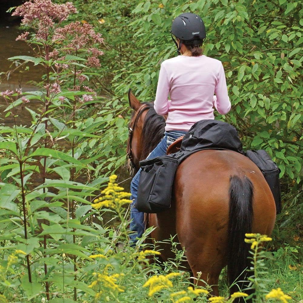 The Dura-Tech Cantle Bag with Insulated Detachable Saddle Bags is an essential item for trail riders. Designed to keep your items within easy reach while on the trail, it features side coolers that keep food and drinks cold for hours. Its tough construction, complete with oversized snaps and zippers, is built to withstand the rigors of the trail, and its smooth, padded underside ensures your horse's comfort. The cantle bag is easy to attach to your saddle with its 4 stainless-steel D-rings and 2 brass grommets. Made with a durable 600 denier polyester outer, dirt and grime can be easily wiped off. Cooler measurements: 12"L x 12"W x 6"T.