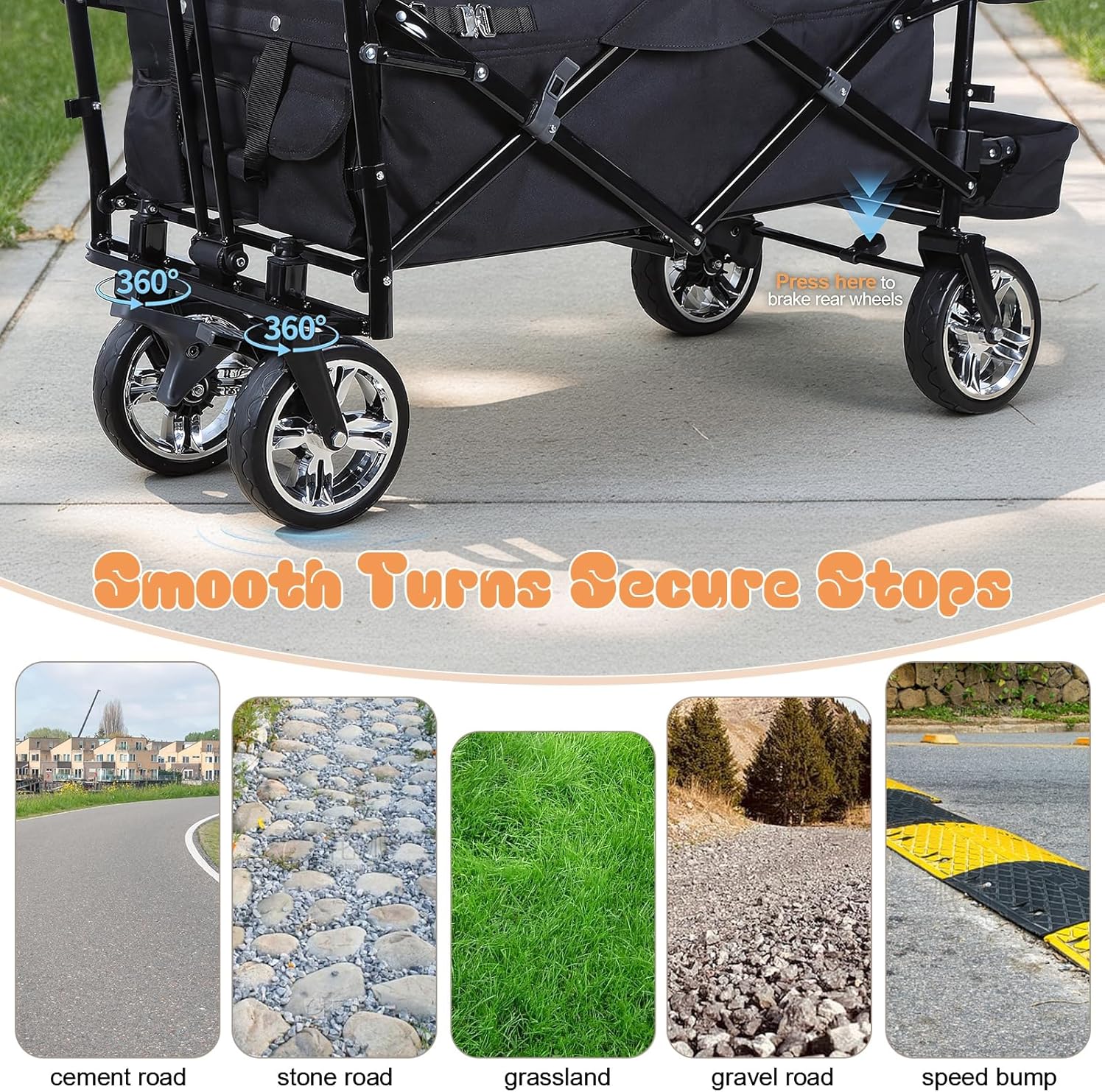 Description:Portable Folding Design: This foldable wagon features a seamless folding process that turns it into a compact size, easily fitting in your car trunk or small storage space, and can be carried with one hand for ultimate portability. No assembly required, convenient for operation and transportation.Flexible Mobility: Equipped with 4 dual-bearing quick-release casters (5" x 2"), 2 of which rotate 360 degrees for all-direction movement, smoothly gliding over various surfaces like pavement, grass, or dirt. The handle extends to 37 inches and can be adjusted to different angles, providing a comfortable pushing/pulling experience.Sturdy Frame: Built with 1mm thick metal tubing frame and double-layered 600D PVC-coated Oxford cloth, this wagon boasts a impressive 100kg weight capacity for reliable performance in outdoor adventures or daily use.Spacious Space: Featuring an enlarged seating area of 22.05" x 22.83" x 26.77", this wagon provides ample space for passengers or cargo. The widened design offers superior comfort compared to standard models on the market. Multi-functional Utility Cart: Whether you're going camping, shopping, or moving things around, this foldable wagon is your trustworthy companionn, offering a convenient and efficient solution for all your outdoor transportation requirements.Item Name: Foldable WagonMaterial: MetalLoad Bearing: 100kgFeatures: Portable, Adjustable Handle, CanopySize Details:L: 120cm/47.24", W: 53cm/20.87", H: 102cm/40.16" (Approx.)Seat: 56cm x 58cm x 68cm/22.05" x 22.83" x 26.77" (Approx.)Package Includes:1 x Foldable Wagon1 x English Manual